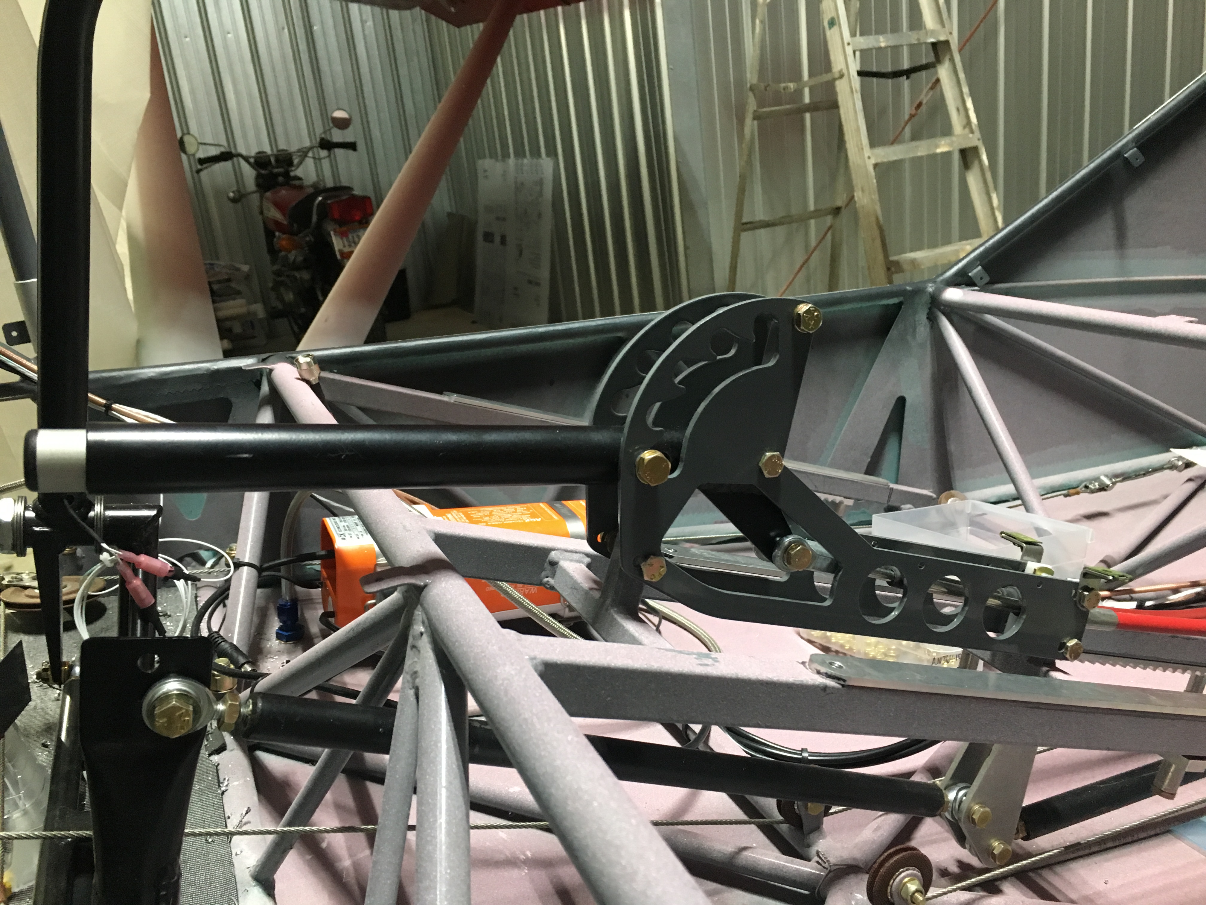 I final installed the flap lever. This was frustrating because somethings are off center and require some odd washer placement. There are also bushings to be fabricated and I don't have a great way for getting those cut perfect, so I end up putting them on and taking them off a lot. In the end I added some washers as well because the right rod end would hit the fuselage frame when I tried to move it to the last detent. I added washers to center the cables better and avoided this. It is still close, so I may file some of it away to provide better clearance. The material that would be filed away is not a structural tube, so I think it will be safe to do.
