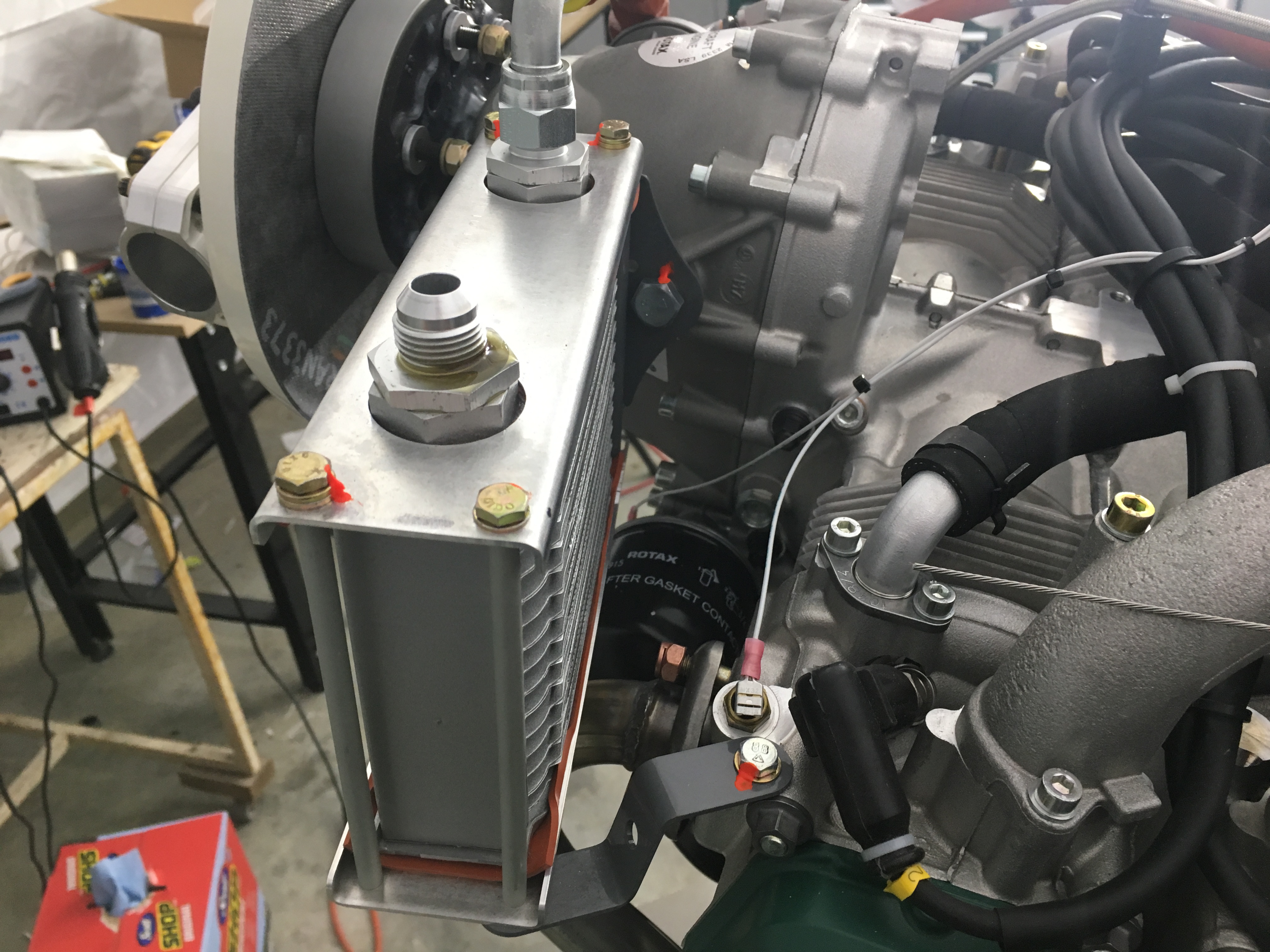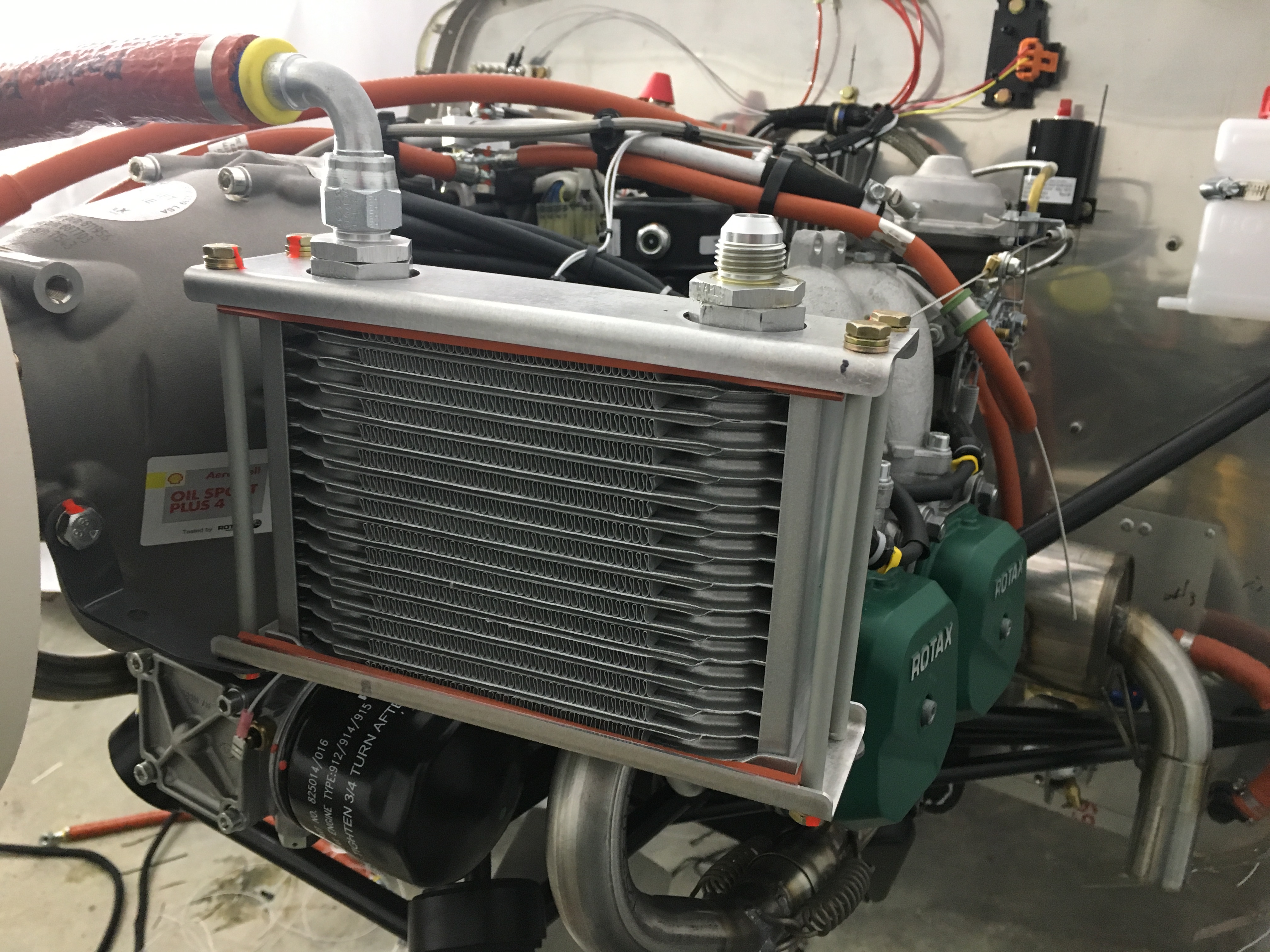 Hoses on the engine have been a not so fun endeavor. The hoses that are giving me problems are the oil hoses and specifically the hose from the oil pump housing to the oil cooler. The provided hose does not lend itself to any sort of acceptable routing and I fussed with it over the course of a few weeks before giving it up. I will have to make my own hose for that run, but I have put it off to accomplish some other tasks I had put off previously. I'm not sure if it was in a previous update, but I fabricated a hose to go from the firewall bulkhead fuel fitting to the gascolator and installed the Rotax fuel hose to the gascolator. I still need to install the return line fuel hose and the fuel pump vent hose. I also will make a vent tube similar to the oil tank breather vent for the fuel pump vent.