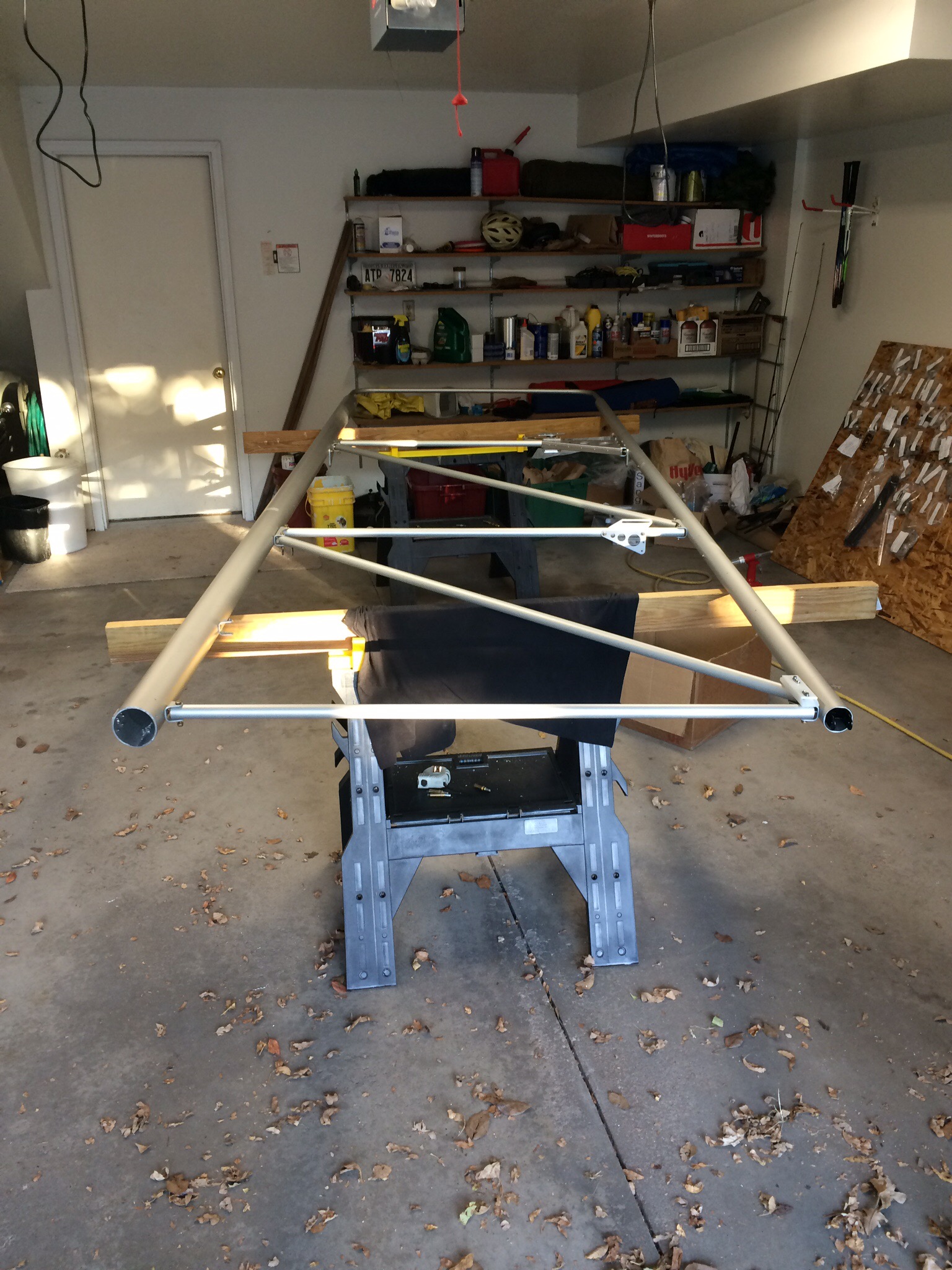 The first thing to note is that I got the rib to clip areas primed. After that Maria helped out and riveted the clips to the ribs. We then riveted the clips to the spar for ribs 4 and 11. One thing I realized after this was that the modified clips for the root rib probably could be riveted in before the trailing edge spar fitting is installed. If you go much further, the rivet for the lower hole in the trailing edge root rib clip hits the spar fitting. Not impossible to deal with, but might make life a little easier. I then worked on getting the ribs into place. This requires the removing of drag braces and one compression tube to get everything to fit right.