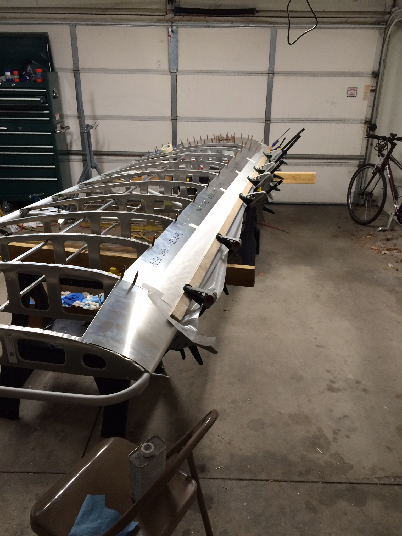 Today the right wing was moved to its temporary home while awaiting covering. It was a lot of fun and went very quick since I didn't have the learning curve of the first wing. A friend helped me finish sanding down the filler on the leading edge and off we went.