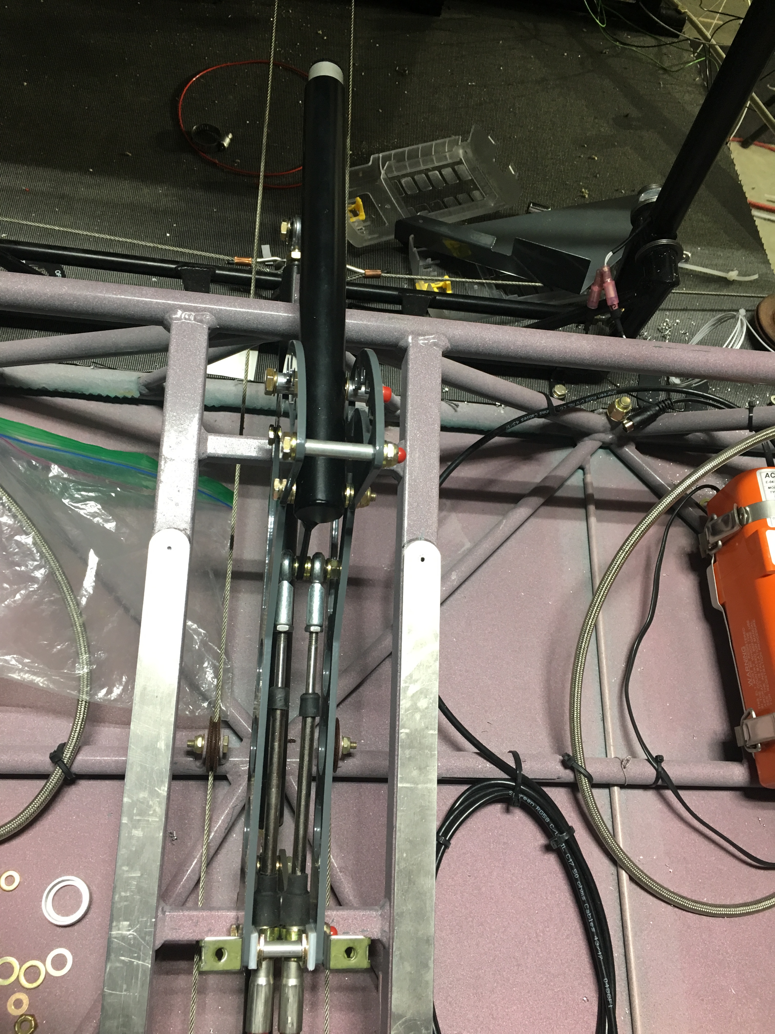 I final installed the flap lever. This was frustrating because somethings are off center and require some odd washer placement. There are also bushings to be fabricated and I don't have a great way for getting those cut perfect, so I end up putting them on and taking them off a lot. In the end I added some washers as well because the right rod end would hit the fuselage frame when I tried to move it to the last detent. I added washers to center the cables better and avoided this. It is still close, so I may file some of it away to provide better clearance. The material that would be filed away is not a structural tube, so I think it will be safe to do.